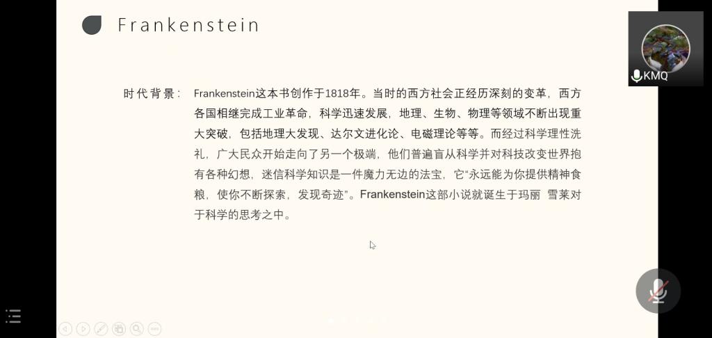 康美群同学以“外刊翻译与《弗兰肯斯坦》阅读分享”为主题,首先对《New York Times》外刊文章翻译做了一个分享,并指出翻译外刊遇到的问题以及自译存在的问题与不足,随后就自己翻译这篇文章做了总结,指出翻译中存在的问题以及翻译过程中积累的经验。最后,康美群同学对自己阅读的书《弗兰肯斯坦》做了简要的介绍与分享。