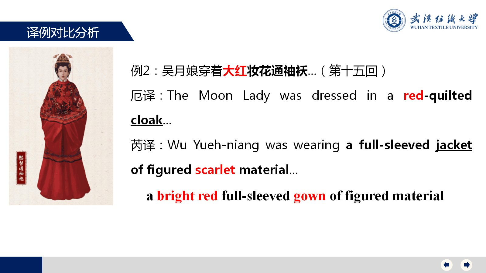 望云姣同学以“《金瓶梅》服饰英译赏析及外刊翻译分享”为主题进行分享。首先,她以“语境理论”为指导,从“服制颜色形制”和“服制内涵意义”两方面,对人物服饰英译进行了具体译例分析。她表示,服饰也是一种语言,一定程度上传达了人物的性格、心理及其他方面的特征。比如“大红”的翻译有“red”和“scarlet”的区别,但在英语语言文化中,“scarlet”有“放荡不羁、淫荡”之意,用在此处便不合适。对于“袄”字,有“gown”和“jacket”两种译法,应结合具体文本,在充分理解源语文本的基础上,选择最合适的词语进行翻译,以保证译文的“忠实性”。随后,望云姣同学还分享了外刊翻译过程中总结的翻译技巧,除了常用的增译、拆译方法外,我们还可以灵活运用中文标点符号,比如冒号、破折号、括号等,增强译文的逻辑性与可读性。