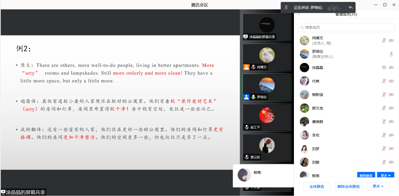 两位同学的分享结束后,罗经理也针对内容做了点评。针对熊孟兰同学的分享,他肯定了内容的时效性和趣味性,也认同了分句进行分析和讲解,但提出了讲解过程中应当适当放慢速度,给同学们留下理解和思考的空间,例如提出上述问题时应该稍作停顿,线上讲座应如线下的演讲一般让听众有反应的空隙。针对涂晶晶同学的分享,于天伦同学提出“我们有时明知是翻译腔的表达而无法避免使用时该怎么办?”的问题,同学们在发表自己的意见后,罗经理认为我们无法用汉语表达出想要的意思是因为我们的汉语水平仍需提高,双语能力要同时加强,提高的方法就是要通过大量的阅读积累。此后,同学们分别针对四句话都提出了新的看法,碰撞出思维的火花。