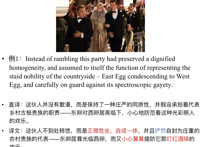 郑震同学主讲的题目是“《了不起的盖茨比》之巫氏译本分析—以生态翻译学为视角”,他的内容分为了四个部分。第一部分,使用了大量电影图片来介绍了本次的翻译主题“了不起的盖茨比”,并对电影故事内容进行了简单描述。第二部分,介绍了作品的译者--翻译家巫宁坤,以及对生态翻译学展开了详细讲解,其中涉及到翻译过程,翻译原则,翻译方法和翻译评判标准。第三部分,从多个维度对巫氏译本进行了分析,并提出了译本的少量瑕疵。最后,郑震同学进行了总结和反思,鼓励我们学习巫氏译本的精湛技巧和翻译风格。两位同学发言完毕后,同学们提出了自己的想法和见解,并得到了一一解答。随后,华敏老师对两位同学的分享进行了点评,她认为左灿同学准备充分,融入了自己的观点和思考,同时针对“正式性用词”提出了疑问还提出了“不同翻译应采取不同翻译理论”。对于郑震同学,华敏老师肯定了他本次的学术精神,认为生态翻译学是个很好的翻译视角,并从各个维度提出了自己的看法,还鼓励我们积极思考在翻译过程中哪些翻译理论适用于指导实践。随后,罗经理肯定了二位的悉心准备,认为左灿同学善于思考,但文中部分用词值得深推。认为郑震同学从多方面阐释生态学翻译可谓见解独特,后期应深入研究。最后,姚范美教授对二位同学进行了点评,她认为左灿同学认真细心,准备充分,郑震同学将理论和实际联系起来,值得我们学习。