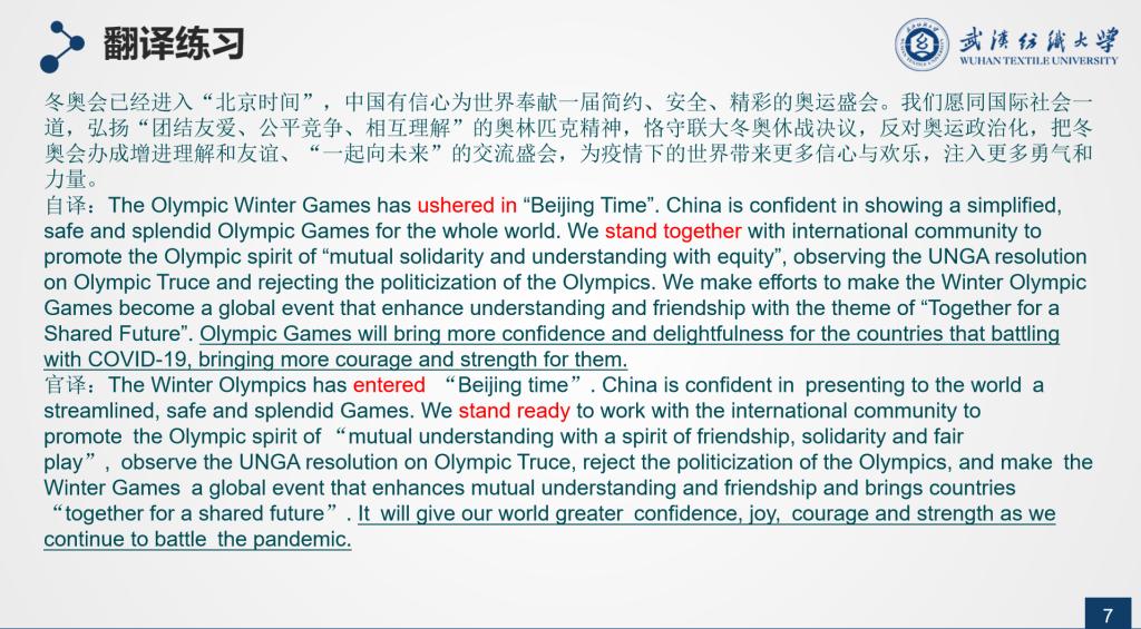 2020级MTI研究生张梦晖同学以“翻译练习评析及小说《飘》中女性服饰翻译分享”为题,内容分为两部分。第一部分,张梦晖同学给我们分享了她就王毅外长《在2021年国际形势与中国外交研讨会上的演讲》所做的翻译练习,将自己的翻译与官方译本进行对比分析,并总结出了一些翻译技巧,比如:重构(短句合并)、加主语,诗句俗语运用意译的翻译方法,并同时加以举例说明。第二部分,张梦晖同学向我们介绍了小说《飘》中女性服饰术语的翻译,总结出《飘》中的主要服饰与出现次数。