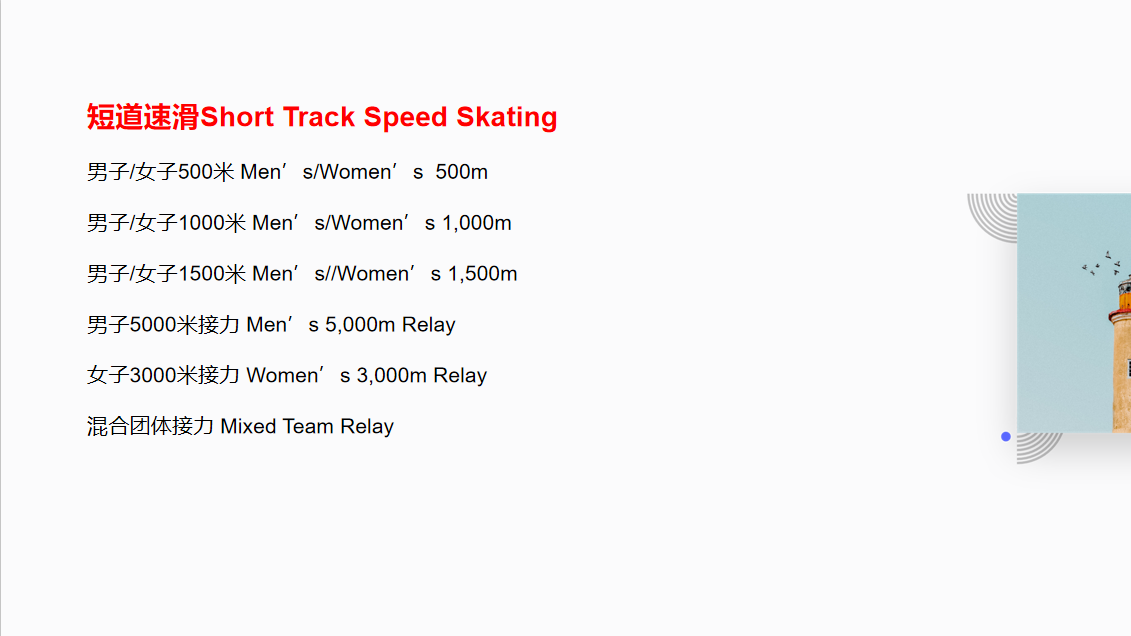 第二位展示者张绘玲同学的主题是“冬奥会运动项目英译及新闻精读分享”,内容主要分为两部分。第一部分,张绘玲同学向大家简要介绍了冬奥会各比赛项目,并给出了项目名称的中英文对照。例如:“短道速滑”的翻译是“Short Track Speed Skating”;“花样滑冰”的翻译是“Figure Skating”。第二部分,她和大家分享了自己对近期体育赛事新闻的翻译,并向大家展示了自己的思考过程。