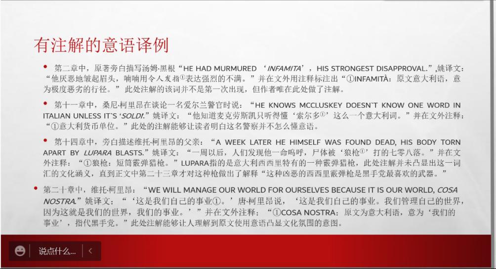 第一位展示者肖博文同学的主题是“从《教父》看杂合理论在多元文化作品的应用——以姚向辉译本为例”,她首先向大家介绍了杂合理论和霍米·巴巴的后殖民翻译理论,并向大家阐明了这两者之间的联系:“杂合理论当前在后殖民文学理论中是一个常用的术语,被用作描述殖民和后殖民时期的一些文学和文化现象,因为殖民运动就是一种使文化产生碰撞的行为,在这种运动中杂合的现象势必产生”。随后,她向大家简要介绍了《教父》这部文学作品以及原文的杂合背景。最后,她以韩子满归纳的五种杂合文本的翻译策略为切入点,对《教父》中的杂合性文本进行了具体分析。