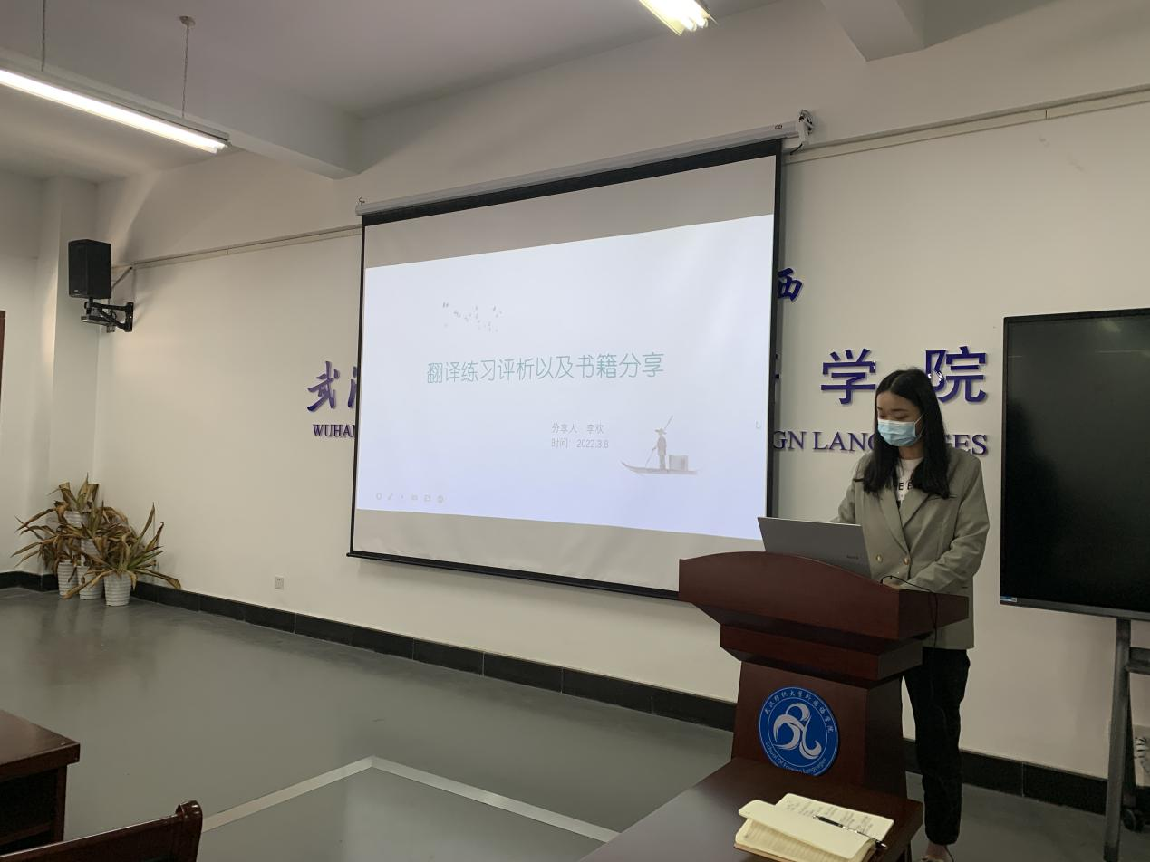 第二位汇报人李欢主题是“翻译练习评析以及书籍分享”。汇报分为两个部分,第一部分以“自然灾害”为翻译材料,将自己的译文与陈小慰的译文进行对比分析。分析完总结出:1.当句子过长或者修饰成分过多,调整语序必不可少;2.适当采取增译法使句子更加清晰流畅;3.为了句子内容衔接更为紧密,可以适当调整词语意思,对句子加以润色。第二部分主要介绍了福建师大学yl6809永利集团教授岳峰的《行业笔译案例库:精选与解析》Case Studies on Professional Translation。本书由来自不同案例组成的翻译案例库,有18个案例,具有一定的代表性和典型性附录还收入了部分重大翻译项目的失误案例。李欢同学分别从词汇层面、句子层面、修辞层面进行了举例分析。