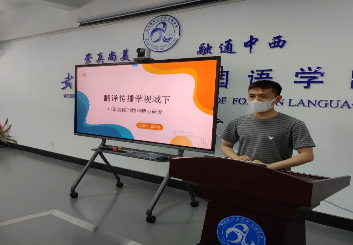 首先进行汇报的是郭文龙同学。他的汇报主题是“翻译传播学视域下电影名称的翻译特点研究”。首先他简要介绍了翻译与传播的关系,并指出“翻译不等同于传播”,而是翻译的传播(translational communication)。随后他总结归纳了电影命名的四个特点——即以“人”命名(如Old Henry)、以“物”命名(如Deep Water),以“主题”命名(如F9:The Fast Saga)和以“历史事件”命名(如Pearl Harbor)。接下来郭文龙同学介绍了传播学理论中的传播五大要素,即经典的“5W”理论:谁Who/说什么What/通过什么渠道Which channel/对谁说To Whom/取得什么效果What effect,并从这五个方面进行举例: