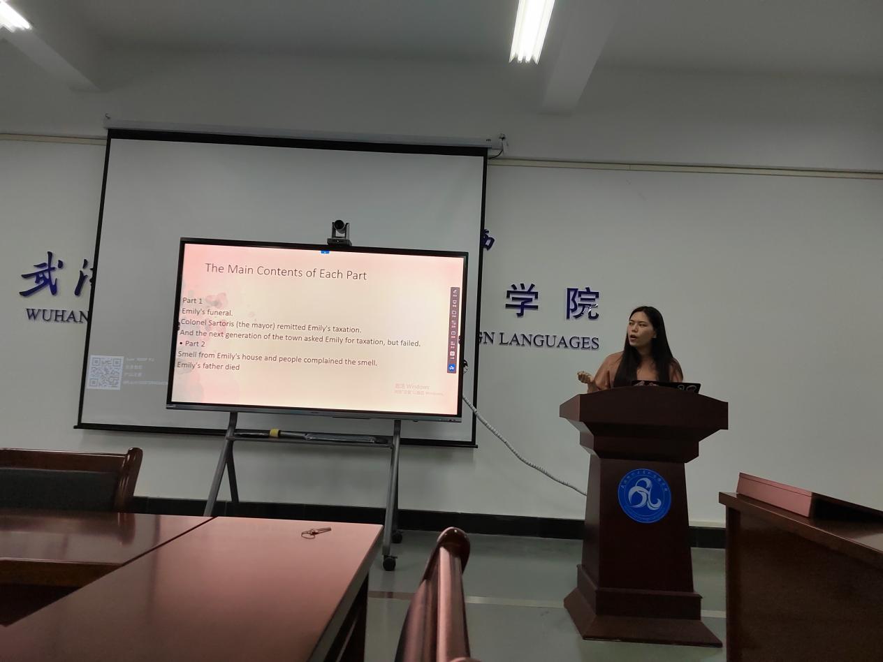 柯萌同学的汇报题目是“《献给艾米丽的玫瑰》读书分享及翻译练习”,她娓娓道来地对原书进行了解读,使得全场师生对此书产生了浓厚的兴趣;接着她针对书中并列形容词和单个形容词的译者译法及个人译法展开叙述,其中对于词汇含义的理解可谓眼光犀利、见解独到。同时,她也提出了两个问题,首先是A Rose for Emily中玫瑰究竟代表的是什么?其次是patient and biding dust如何翻译比较好。