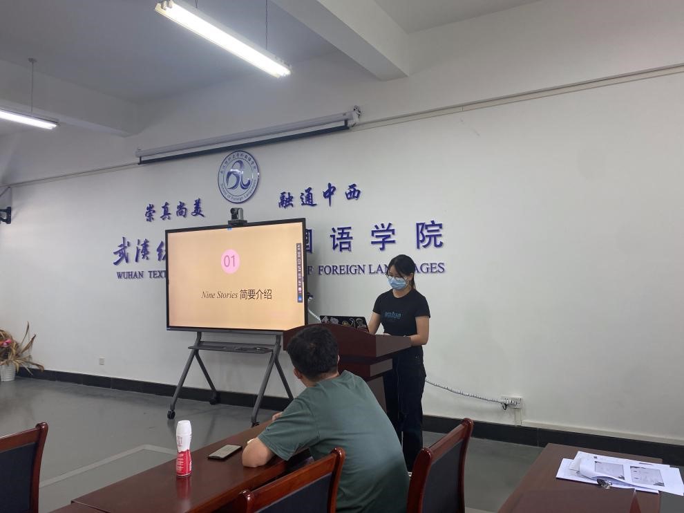 代焦同学的汇报题目是“A Perfect Day for Bananafish(《逮香蕉鱼的最佳日子》)小说及翻译实践分享”。汇报内容主要分为四部分。首先是对Nine Stories(《九故事》)的作者和内容作简要介绍;其次是对其故事情节、写作特点进行概括,并对书中消费主义、治愈天真、心灵创伤、孤立进行读后反思;接着,她通过译文的对比与分析向观众展示了她的翻译实践情况;最后代焦从个人感悟和实践反思两方面对于本次汇报进行全面反思与总结。在讲述的同时,她也提出了讨论问题:作者在《九故事》开卷语引用禅宗公案的意图是什么?香蕉鱼的内在含义是什么?