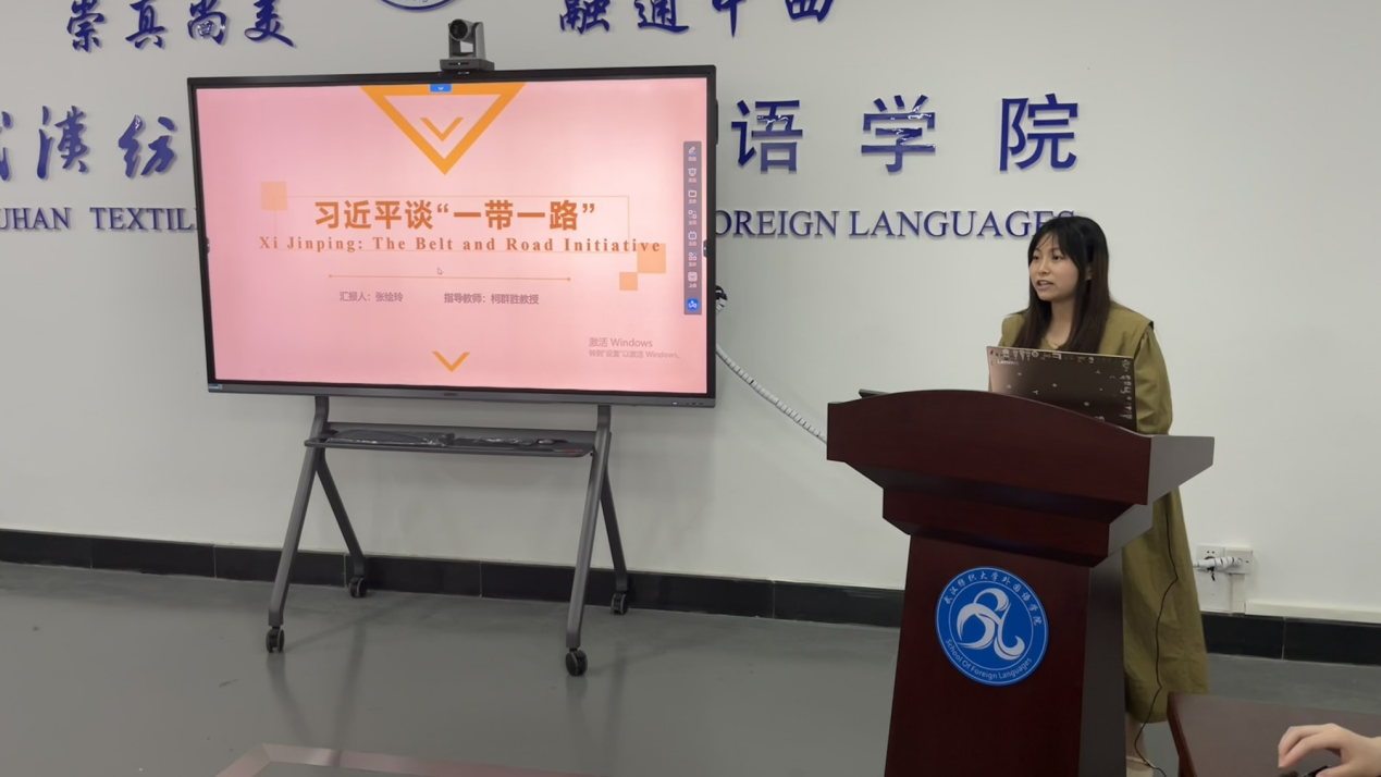 第二位进行汇报的是张绘玲同学,她的演讲题目是“习近平谈‘一带一路’”,一共分为四个部分。首先她向我们介绍了《习近平谈“一带一路”》这本书,同时向我们介绍了一带一路给沿线国家带来的影响。在第二部分,她选取了这本书中部分中文和英文翻译,向我们分享了外宣文本的好的译法。例如“夫物之不齐,物之情也”可以译为“Thingsareborntobedifferent.”在第三部分,她以端午节为例,向我们介绍了一带一路给沿路国家带来的文化影响。她分别介绍了韩国、日本、越南、新加坡等国家的端午节。由此她引出了端午节在国际上的传播:提高了中国的国际影响力,促进了文化融合,提高了我国文化自信。最后一部分,她指出端午节的国际传播存在些许问题,比如传播手段单一等。