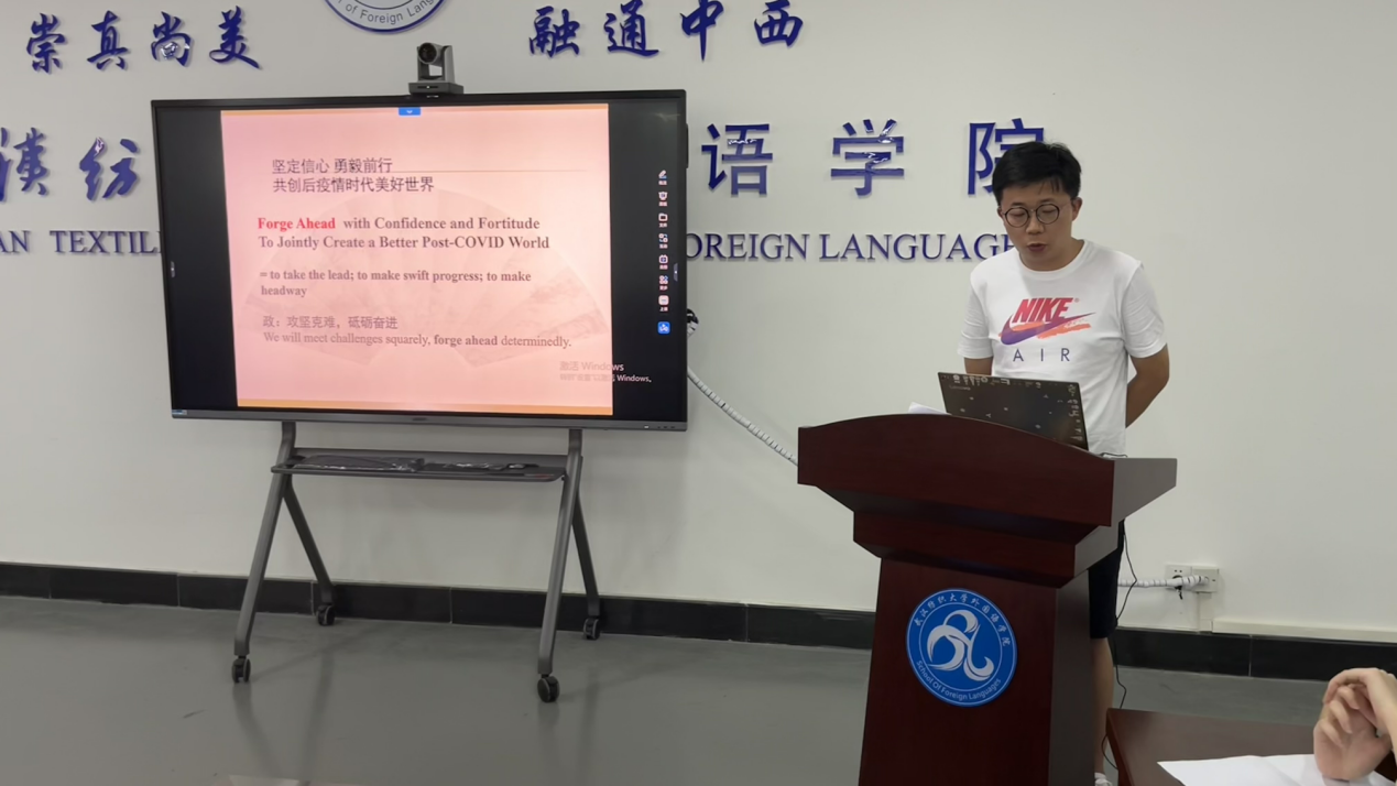 第三位分享的同学是郑震,他的题目是:“习近平最新时政文本翻译阅读分享”。他的分享结合三个方面的译本来进行分享,分别是官方话语、政府工作报告和CATTI历年真题。他将自己的译文和以上三种官方译文做对比,分析自己在翻译中存在的问题。他的翻译实践中有许多词汇值得我们积累,对我们CATTI考试很有帮助,例如“天下之势不盛则衰,天下之治不进则退”可以译为“The momentum of the world either flourishes or declines; the state of the world either progresses or regresses”;“惊涛骇浪”可以译为“amidst the raging torrents of”;“家庭结构变化”可以译为“and change in family structure”;“急刹车”可以译为“slam on the brakes”;“人文交流”可以译为“People-to-people exchanges”,“Government-to-government exchanges”,“Cultural exchanges”,“People-to-people and cultural exchanges”等。最后他还给我们分享了一些热词。