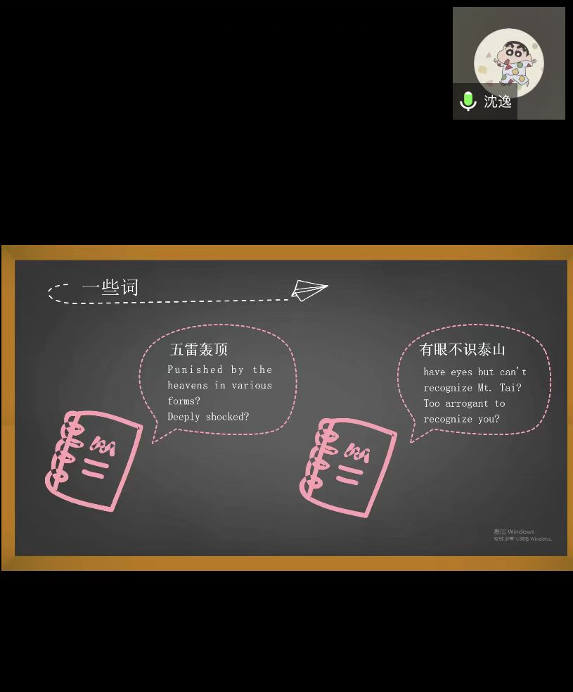 最后是沈逸同学谈“爽文”翻译。他首先介绍了爽文的定义以及“爽文”改编的电视剧。沈逸将“爽文”的正确打开方式作为主题,带领师生领略了“爽文”这一特殊文体的魅力。在简介“何为爽文”后,沈逸介绍了翻译“爽文”的译前准备工作,包括确定类型、通读全文、查找术语等。他选取的译文同样是译国译民公司的真实素材,比如“五雷轰顶”“有眼不识泰山”“金针九渡”等词汇的翻译。他还列举了有代表性的机翻例子,并通过自己的修改润色使译文更流畅地道。沈逸在总结中指出:翻译时除了应该尊重文本、拓宽知识面,更要筑牢汉语基础、勤加练习,这样才能保证译文质量。
