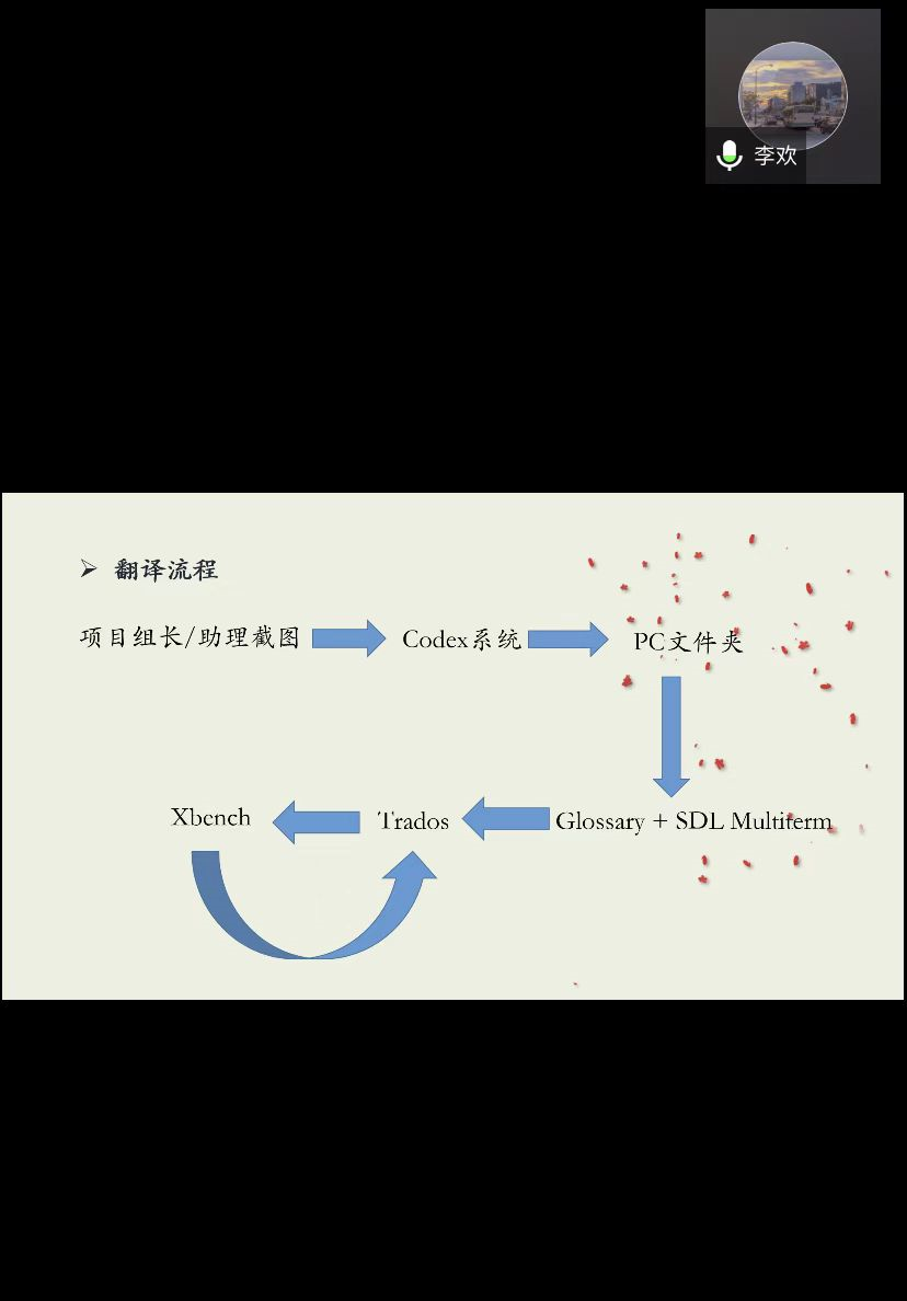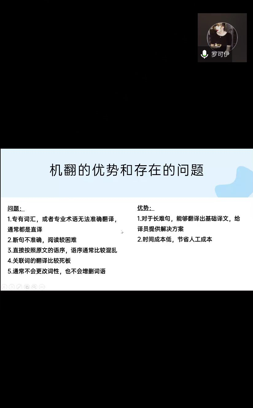 第一位汇报人罗可伊同学的主题是“机器翻译中的错误分析与译后编辑—以医学翻译为例”。首先,她简介了MTPE及其存在的优势和劣势,并展示了源文本的来源,即BioSpace平台。借助的机器翻译平台为商鹊网,此网站利用大数据进行信息抓取后呈现可用的机翻稿件。然后,罗可伊对机器翻译中的常见问题进行分析,问题包括部分专业术语无法准确翻译,断句不准导致译文逻辑混乱,词性辨别有误等。针对有疑问的译文,罗可伊向听众抛出疑问—“highly malignant type”除了译为“恶性程度很高”,是否有更合适的译文?最后,她总结了在译国译民公司实习期间使用机器翻译的心得:机器翻译能大大提升工作效率,在充分利用机器翻译的同时,译者需要对机翻译文进行调整和润色,确保译文质量。