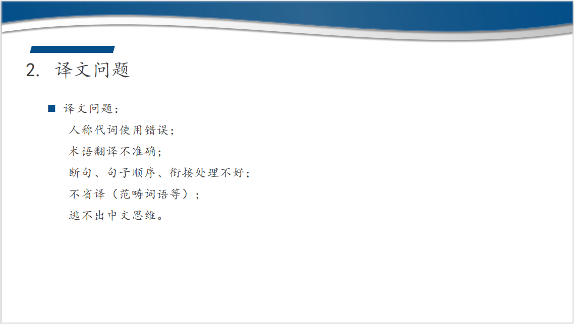 第三位汇报人武静波同学结合实际经验,为我们讲述了一些高频词汇的汉英翻译误区,呼吁大家打破思维定式。武静波摘取了几个常见的英语单词,分别为“make”,“talent”,“people”,“access”以及“promote”,结合具体翻译练习指出了我们普遍存在的中式定向思维。在介绍完这些词汇在具体语境中的地道英译方法后,武静波呼吁大家多多反思,打破思维定式,发人深省。