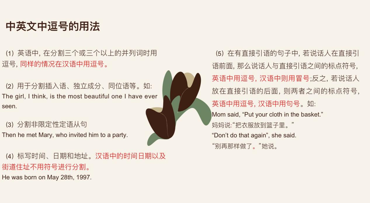 第三位汇报人张涵钦同学分享的主题是英汉常用标点符号对比。张涵钦谈及了标点符号的起源及重要性,通过举例将中英常见标点符号进行对比。此外,她补充讲述了英语字母大写的用法。标点符号与大小写虽然是小细节,但直接决定了译文的质量和水平,因此把握好小细节,才能创作出好译文。
