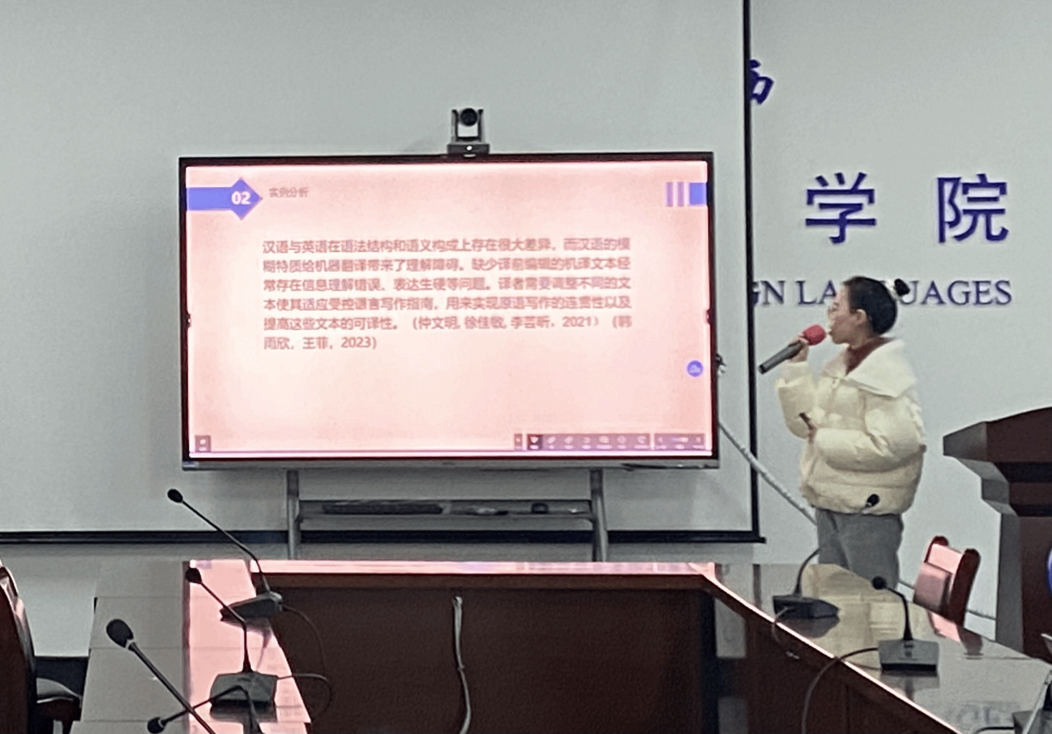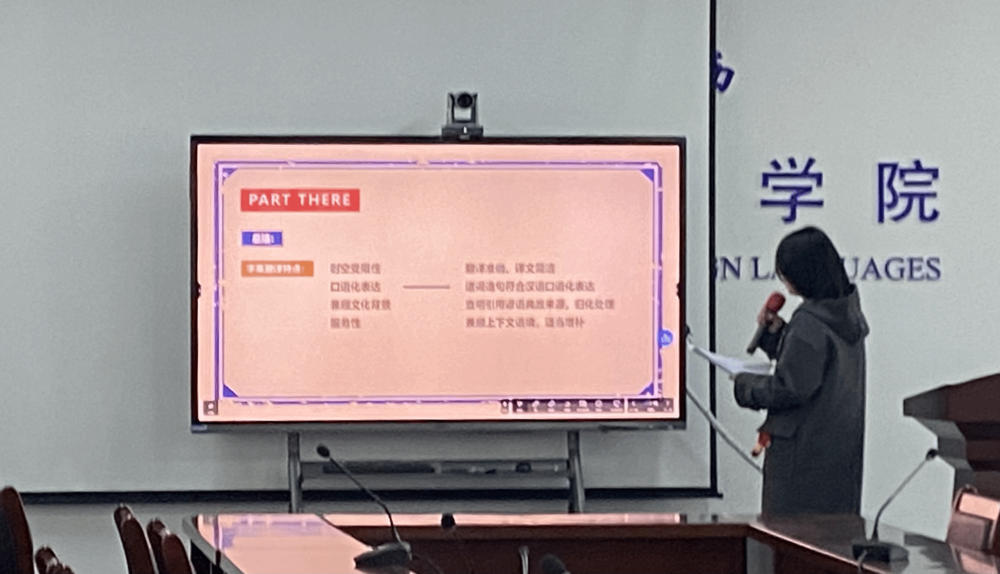 第三位分享人范思芸同学的分享主题是《从变译理论视角讨论影视剧字幕翻译——以“致命女人”第二季为例》。她以《致命女人》第二季的字幕翻译为切入点,从变译理论的视角出发,深入探讨了影视剧字幕翻译中的策略与技巧。她的研究揭示了在保持情节连贯性的同时,如何在不同文化语境中精准传达情感和信息。