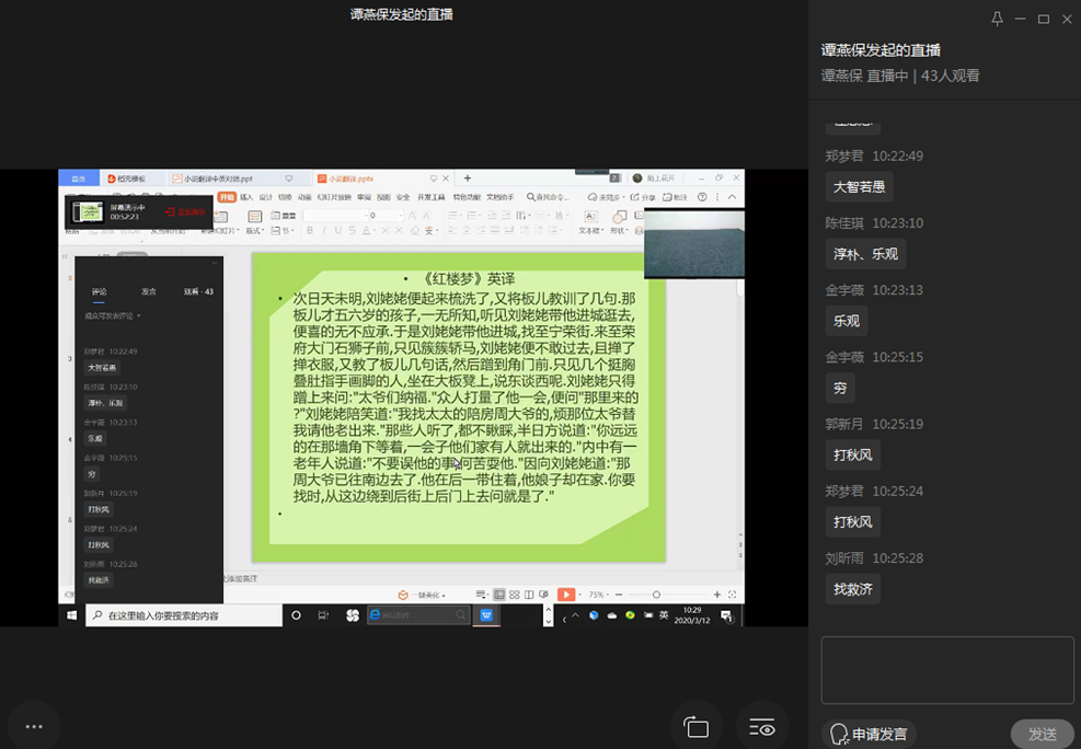 谭燕保教授的一堂“翻译名著赏析”给人印象深刻,从《红楼梦》人物性格分析,到翻译风格、翻译标准的诠释,再到翻译背景的欣赏,非常自然导入知识点,课堂设计精湛,近2小时的授课,从课前提前15分钟的NPR美国在线新闻热身,到课中知识点的导入,再到作业的布置,采用企业微信授课信息量大,与员工互动频次多,使员工感觉授课内容很有趣,获得感强,反映老师深厚的文学功底,授课精湛。