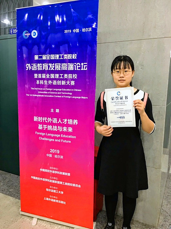 “言趣移动英语学习平台的构建”项目在6月曾获“首届全国理工类院校本科生外语创新大赛”中部赛区一等奖,并获得参加全国总决赛资格。暑假期间,指导老师又对选手进行细致指导,反复打磨项目总结和现场演示材料。在总决赛中,该项目同全国三大赛区选送的北京航空航天大学、华中科技大学、中国石油大学、南京理工大学、合肥工业大学等二十多支知名兄弟高校的优秀团队进行了激烈角逐。最终,项目负责人王安澜同学在比赛现场沉稳发挥,在项目组中脱颖而出,以第四名的成绩获得一等奖。