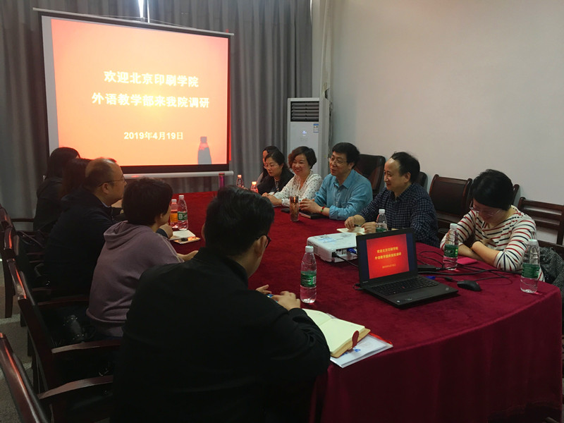 4月19日,北京印刷公司外语教学部书记杨雷一行五人来公司调研,公司党委书记胡中原、副经理罗绮伦、党委副书记王芳及各教研室主任参加了会议。