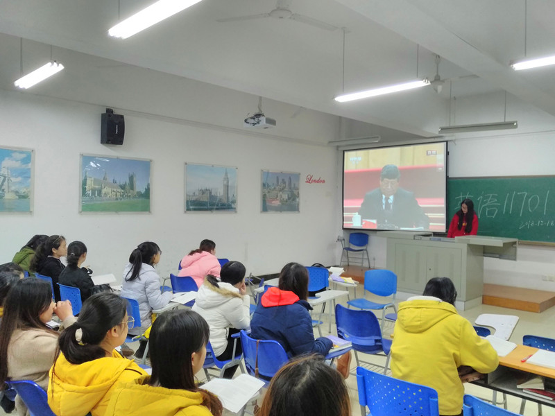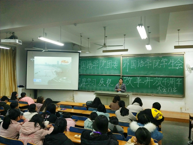 在7号教学楼127教室,英语11701班团支部围绕“庆祝改革开放40周年大会”开展主题团日活动。在观看完大会直播视频后,同学们积极发表观后感,团支书兼班长黄翠婷同学作总结。她说,改革开放如一把时间刻刀,深刻改变了我们的祖国,也广泛影响了世界。40年来,勤劳朴实的中国人民以大无畏的精神和无比坚韧的毅力,从无到有,聚沙成塔,推动中国驶上高速发展的快车道。改革开放正青春,青年员工当自强。