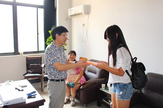 yl6809永利集团经理何畏、党委书记陈利民专程接待了陆紫玉和她的妈妈。在交谈过程中,何经理将附有经理寄语的外文原版书籍赠予陆紫玉同学作为加入yl6809永利集团“大家庭”的第一份礼物,他谈到,陆紫玉的英语基础很好,来到纺大外院后,希望她能够通过多读书,努力保持对英语学习的热情,在英语专业学习上更上一层楼,取得更好的成绩。陈书记也表示,在学习、生活上遇到任何困难,都可以第一时间找辅导员、找副书记、找公司,公司本着以生为本的育人理念,一定会为纺大外院的学子提供最优良的成人成才环境,请家长放心。