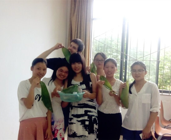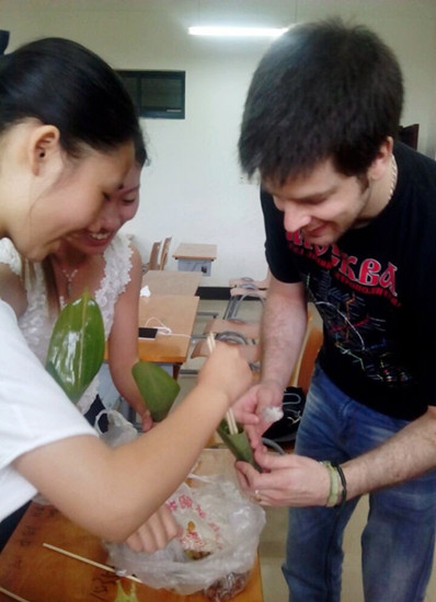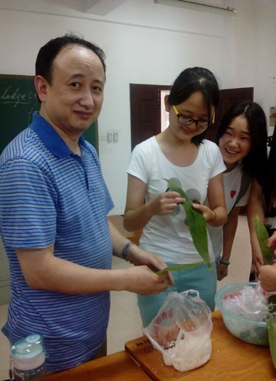 和外教一起包粽子:让外籍教师感受中国传统节日的乐趣和魅力。此次活动,同学们邀请到西班牙籍口语老师Nestor一起包粽子,第一次接触包粽子,Nestor表现出极大地兴趣,他认真地向同学们学习制作技巧,还不断询问端午节的由来和传统习俗,“错误”不断,笑声不断。包完粽子,同学们和外教合影留念,并送上粽子作为礼物,让外国教师品尝中国的味道。