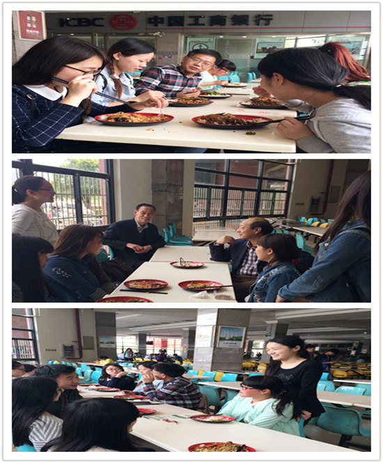 (公司党委副书记刘功成等校领导与结对宿舍的员工们边吃饭边交流)