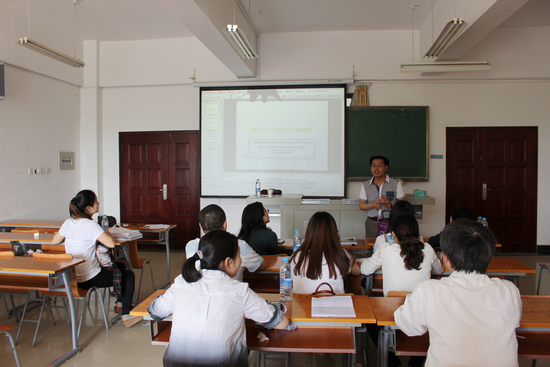郭博士从团队的使命、优势、面临的挑战等三个方面对团队建设提出了建议。通过研讨,大家明确了该团队的三个主要研究方向:一是翻译与比较文化方向和翻译与纺织文化方向;二是翻译与比较文化方向包括“西人眼中的中国”系列著作汉译实践,以及比较文化与译学研究;三是翻译与纺织文化方向是指结合公司的特色,开展中国纺织文化及服装文化外译实践及研究。郭博士提供了一些可供研究的选题,与会教师就现代性与翻译、“西人眼中的中国”、中华纺织文化与翻译等问题与郭博士进行了热烈的讨论。