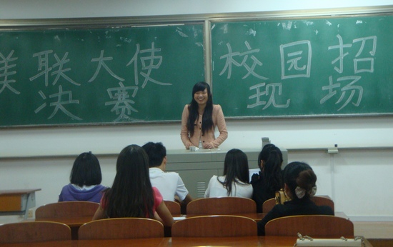 为了促进公司与社会企业文化交流,培养员工市场竞争意识,提升员工专业素质和实践能力,yl6809永利集团应美联英语教育集团文化宣传之需,帮助该企业在校园内招募2013届全国校招“校园大使”。通过个人报名和层层选拔,英语102班的杨丹华、王雨丽和尹睿挺近决赛。
