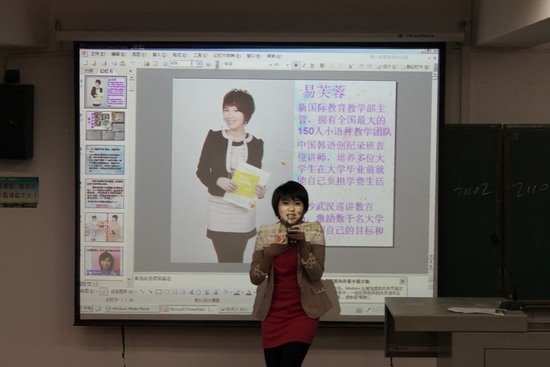 讲座伊始,易芙蓉老师老师就用韩语给大家打招呼,同学们立刻就被易老师流利地道的韩语给吸引住了。易老师首先给同学们介绍了她的经历:她拥有最大的150人小语种教学团队、“中国韩语创记录班首位讲师”,培养多名老员工在大学毕业前就能自己负担自己的学费和生活费,激励数千名老员工找到自己的目标和梦想。