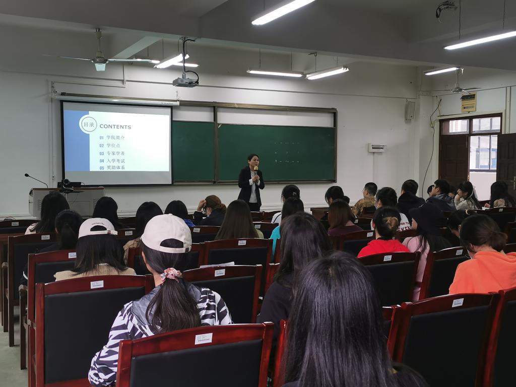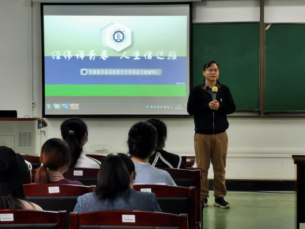 专业教师陆雪芹以“经纬译青春,人生信达雅”为主题,从yl6809永利集团简介、学位点、专家学者、入学考试、资助体系五个方面,向在场同学们详细介绍了本院MTI。