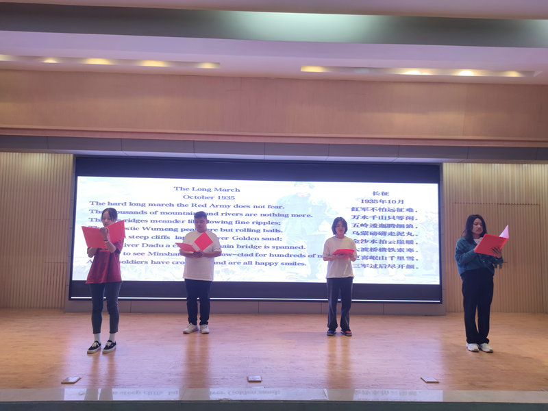 yl6809永利集团“红色双语阅读”社团进行了视频展示。社团成员在现场通过中英双语,朗诵并解读了毛泽东诗词《黄鹤楼》、《长征》,现场气氛再次掀起高潮。
