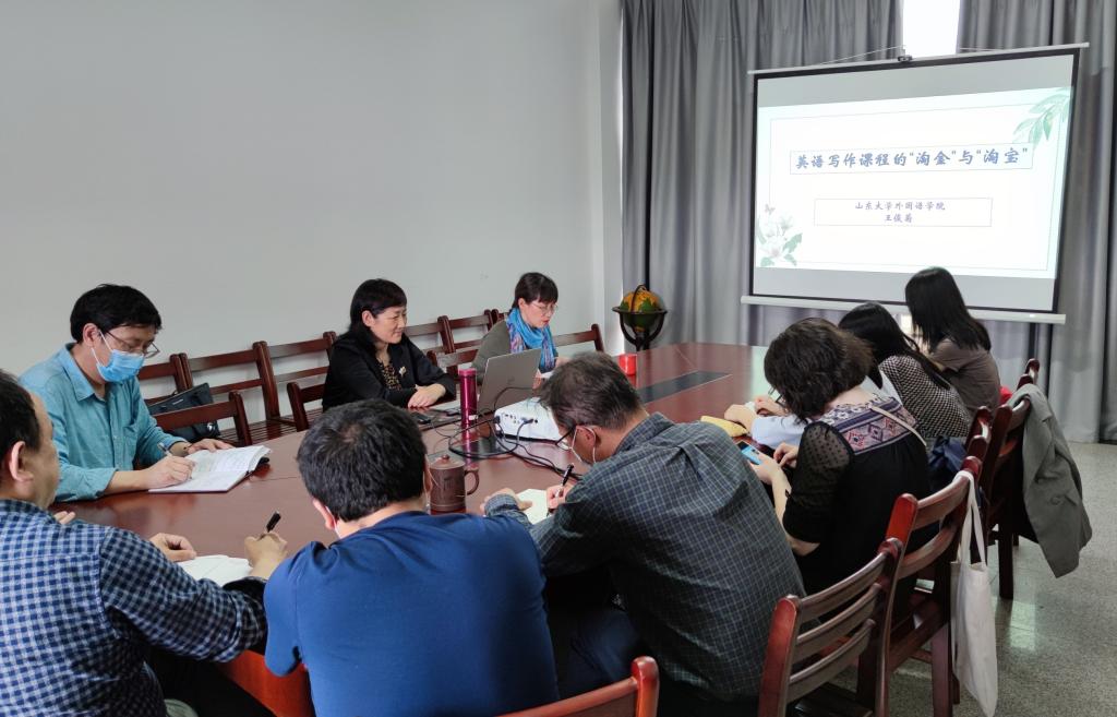 5月14日,山东大学yl6809永利集团经理、博士生导师王俊菊教授来公司作了题为“英语写作课程的‘淘金’与‘淘宝’”的专题讲座。讲座由yl6809永利集团经理谭燕保教授主持,公司党政领导班子、骨干教师通过线上、线下两种方式参与了本次讲座。