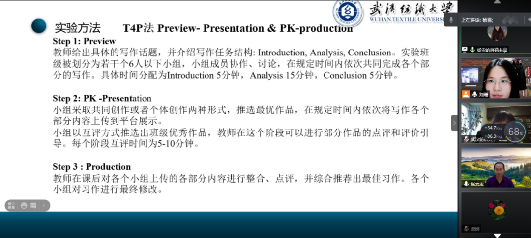 杨雪老师的T4P法行动研究分为3个步骤:Preview,PK-Presentation,Production。教师通过任务的分工,将文章结构分成3份任务进行提交,员工明确认识文章结构3部分的不同功能。她建议可适当添加一些有挑战的环节,以增添妙招活动的新鲜感以及参与活动后的学习成就感;加强小组内部的监控,监督组内互评,以确保所有小组成员都参与了小组活动。