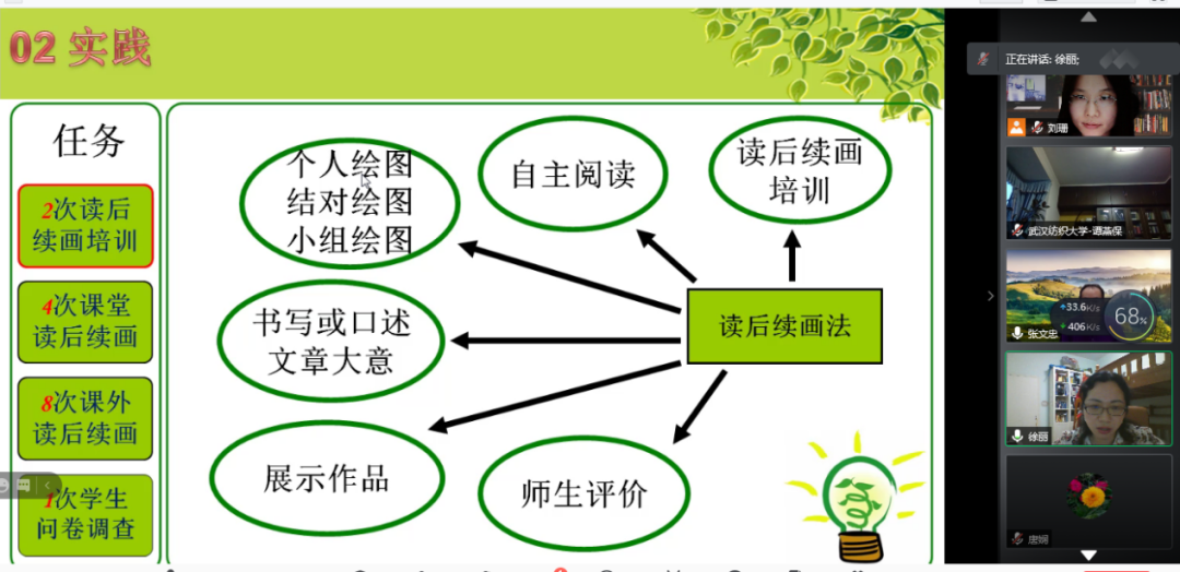 黎杨老师对T4P小妙招进行了三方面的调整:全班讨论一个话题;Presentation & Pk 环节替换成辩论;提供语言资源。他通过工作表(Students’Worksheet)收集一般性的陈述和报告支持性细节。经过两轮实践,他发现很多员工在写作文即产出环节,思想和语言表述上达到令人满意的效果。徐丽老师在学术英语阅读课堂运用了读后续画法来检验员工阅读文章的效果。她一共进行了两次读后续画的培训,四次课堂读后续画活动,八次课外每周个人读后续画读书汇报任务。