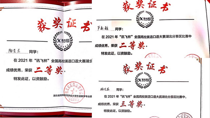 6月20日,由科大讯飞股份有限公司和湖北省高等教育学会大学外语教学专业委员会共同主办的第一届“讯飞杯”全国高校英语口语大赛湖北省决赛在武汉科技大学完美落幕。公司会计11906陶圣兰、英语11901严新雅同学获得省决赛二等奖,服工11901杨艾茹同学获得省决赛三等奖的好成绩。