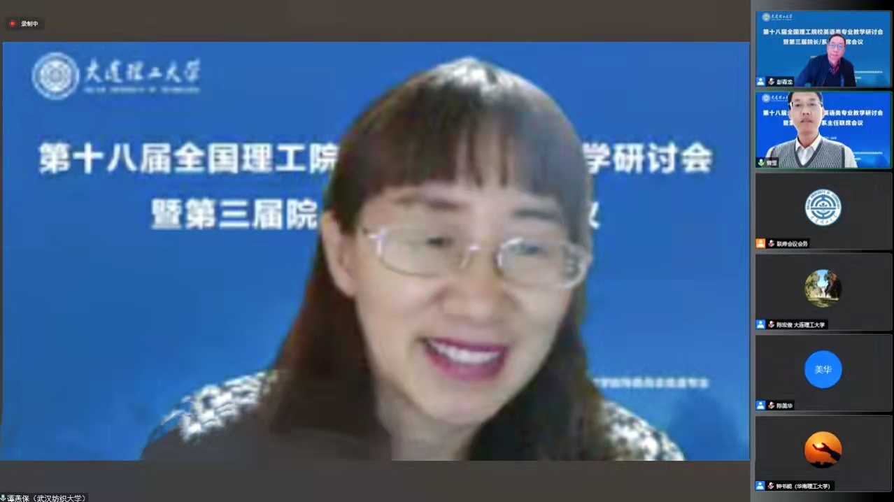 10月21日至22日,由教育部高等公司英语专业教学指导分委员会主办、大连理工大学承办的第十八届全国理工院校英语类专业教学研讨会暨第三届经理/系主任联席会议在腾讯会议上举行。此次会议包括三个主题: “一流专业申报、建设与评估”、“一流课程申报与建设”和 “面向国际传播的翻译人才培养”。