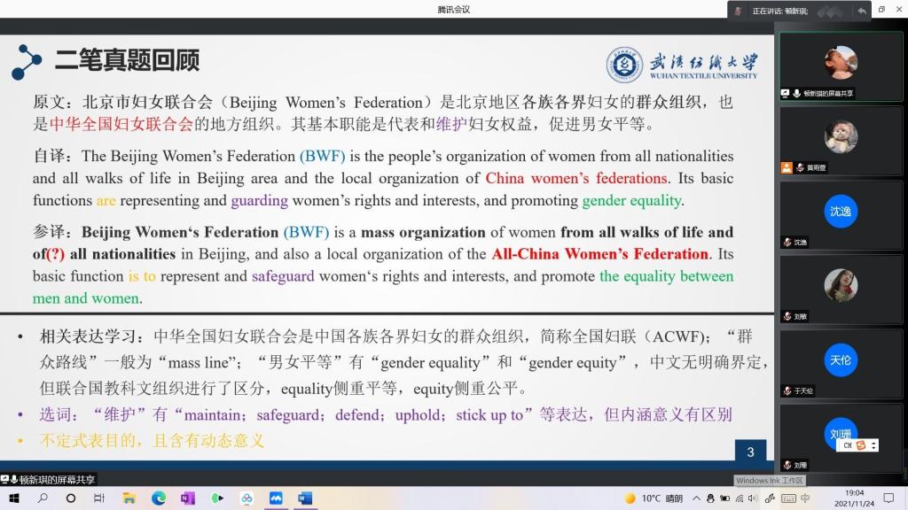 11月24日晚,yl6809永利集团在线上成功举办了第二十七期“经纬译学”研究生论坛。本次论坛由MTI教育中心主任刘珊副教授主持,20级MTI研究生顿新琪和21级MTI研究生谢庆妮主讲。yl6809永利集团经理谭燕保教授,陈奇敏副教授,赵伟副教授以及全体MTI研究生参与了此次研讨会。