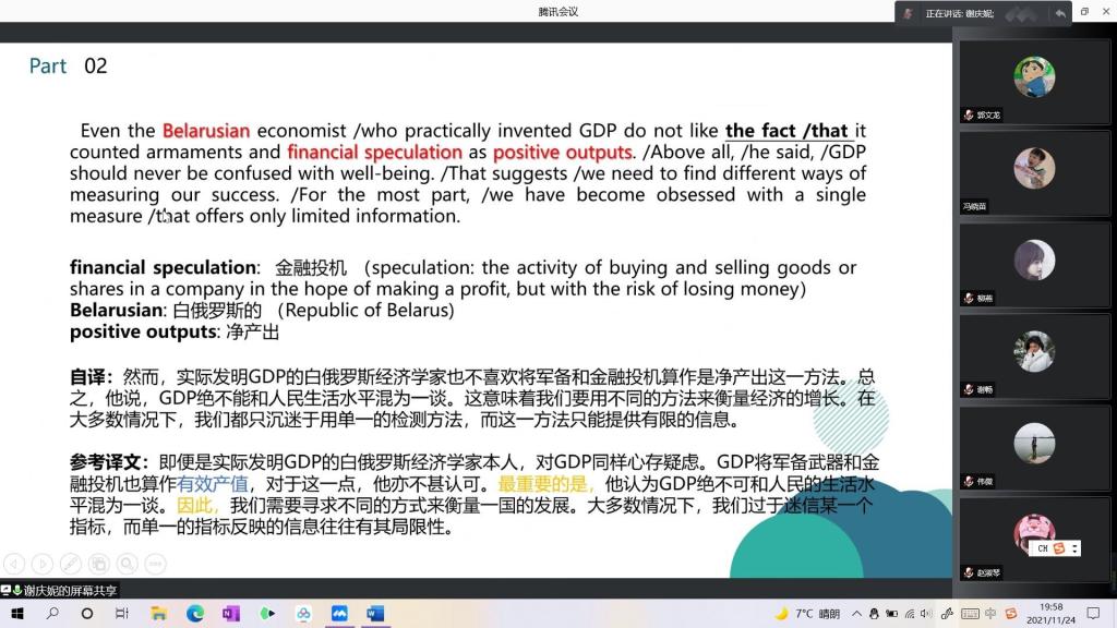 谢庆妮同学分享的主题是“外刊翻译评析及《论英汉的时空差异性》”,内容主要分为两部分。第一部分是18年的二笔英汉真题,题为“Why GDP Is a Terrible Metric for Success and Wealth? ”该翻译练习角度新颖,从政经角度扩展了同学们的知识面,分享了一些政经概念和表达。第二部分,谢庆妮同学讲述了汉英对比分析,从时空性、被动式、主客体三个方面进行了阐释。两位同学的分享结束后,刘珊老师针对内容作了点评。对于顿新琪同学的分享,刘珊老师肯定了该同学的表达能力,认为该同学在讲述《如何撰写翻译实践报告》时分析地十分详细透彻,为21级员工提供了经验和方法。陈奇敏老师随后也提出了该同学的一些不足,例如对于文本中的一些抽象表达,可以结合例子去理解分析。对于谢庆妮同学的分享,刘珊老师认为该同学准备充分,但有些分析不够透彻,还有很大的进步空间。随后,赵伟老师和陈奇敏老师分别对谢庆妮同学表达了赞赏,赵伟老师认为谢庆妮同学很有想法,思维活跃,陈奇敏老师则认为其对参考译文的批判精神十分可取,值得大家学习。