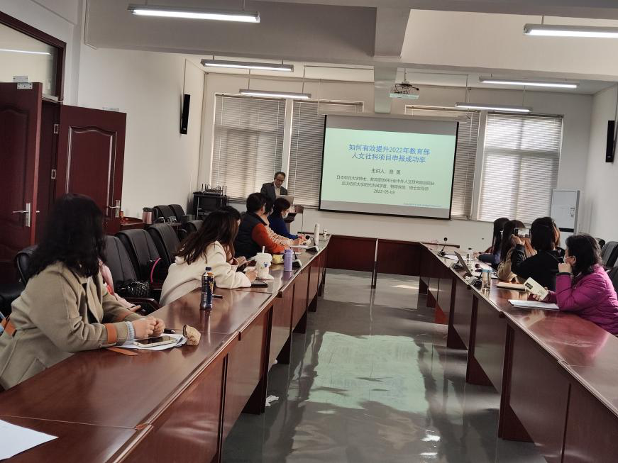曹勇教授以《如何提升2022年教育部人文社科和国家社科项目申报成功率》为题,结合自己多年的申报和评审经验,立足“两个一百年”历史交汇点,介绍了教育部人文社科项目的申报范围、类型、资助力度和申报条件,并分析了近5年来教育部人文社科项目立项情况。他从评审专家视角对项目评审标准进行了深入解读和剖析,总结出国家项目申报要点:选题要靓,问题要真;点题要快,落笔入题;破题要准,立竿见影;立体要新,深入浅出;解题要巧,新巧有效;结题要实,量质并重。讲座结束后,曹勇教授还和申报教师教师逐个进行交流,对他们的申报书提出了具体的、精准的建议。