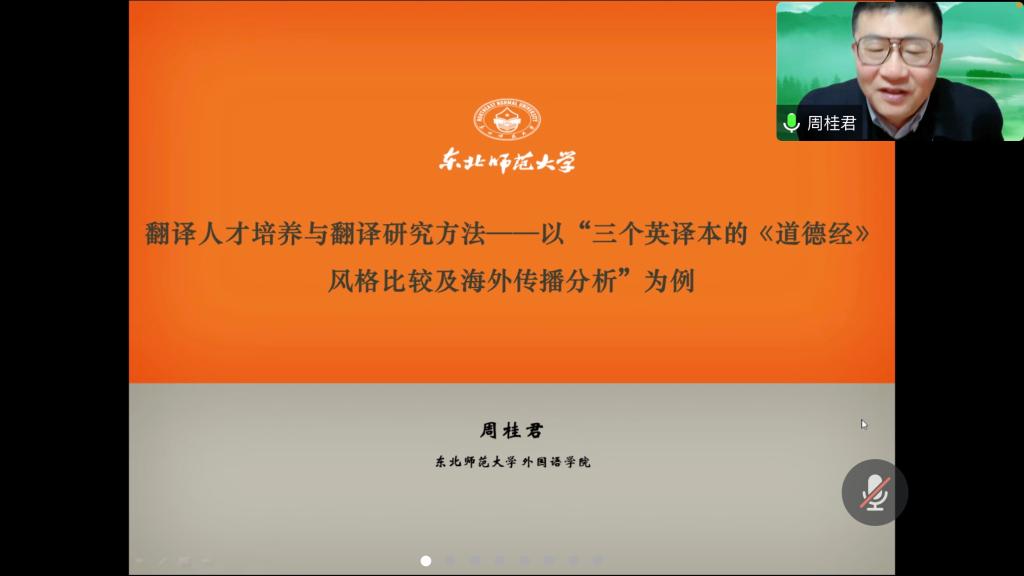 10月11日晚7点,东北师范大学博士生导师周桂君教授应yl6809永利集团之邀,在云端为全体教师及MTI研究生作了题为:翻译人才培养与翻译研究方法的学术讲座,讲座由经理谭燕保教授主持。