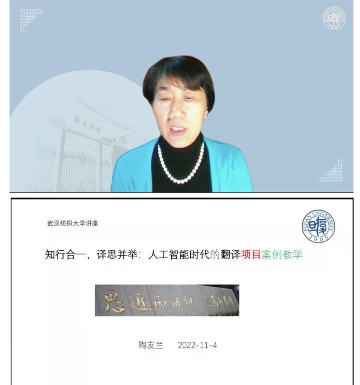 11月4日晚7:30,yl6809永利集团邀请复旦大学翻译系主任、MTI教育中心主任、博士生导师陶友兰教授在云端为全体教师做了一场精彩的学术讲座,题目为:知行合一,译思并举:人工智能时代的翻译项目案例教学。讲座由经理谭燕保教授主持。