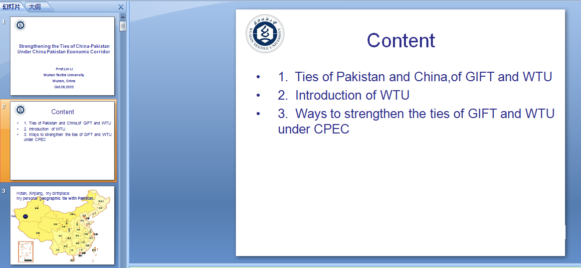 林莉教授结合中巴经济走廊的建设背景阐述了加强“中国-巴基斯坦”合作的意义。林莉教授回顾了自己两次访问巴基斯坦高校的经历,并从校际互访、师生交流、科研合作、职工培养、员工资源等方面介绍了公司与巴基斯坦在高等教育领域的合作情况。她特别指出,在2020年武汉爆发新冠疫情的艰难时刻,公司巴基斯坦籍职工选择留守武汉、留守纺大,与武汉共克时艰,并在巴基斯坦媒体上为中国发声,为武汉正名。现了中巴全天候战略合作伙伴关系。此次会议是公司与GIFT大学在教学领域合作的一次全新尝试,今后纺大将继续与巴基斯坦相关高校保持密切联系,深化友好合作。
