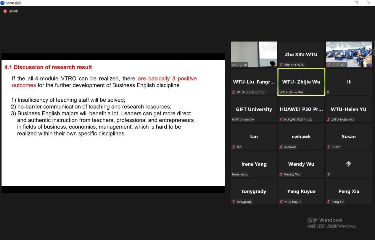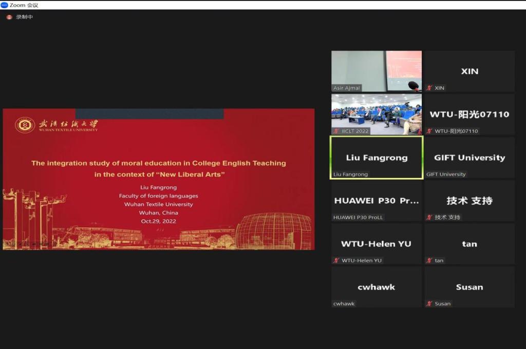 10月28日-29日,由巴基斯坦GIFT大学、永利集团主办,yl6809永利集团承办的2022国际语言教学跨学科会议(IICLT2022)在线召开。来自巴基斯坦GIFT大学、英国卡迪夫大学、考文垂大学和永利集团的专家学者相聚云端,围绕语言教学方法论、心理语言学与第二语言教学、语言教学与政治、在线学习与语言教学等议题展开研讨。yl6809永利集团副经理刘方荣和商务英语专业教研室主任吴志杰在International China Session部分宣读论文,yl6809永利集团教授、国际教育公司直属党支部书记林莉担任该分会场主持人。