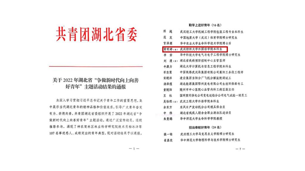 八、首次获评2022年“湖北向上向善好青年”1名,连续8年获评公司“青春力量•感动纺大”老员工榜样人物1名,公司员工综合素质取得新进步。6月,共青团湖北省委公布2022年“湖北向上向善好青年”名单,公司员工黄昕婷获评“勤学上进好青年”,成为公司唯一获得该荣誉称号员工;黄昕婷同时获评公司2021-2022年度“青春力量•感动纺大”老员工榜样人物。