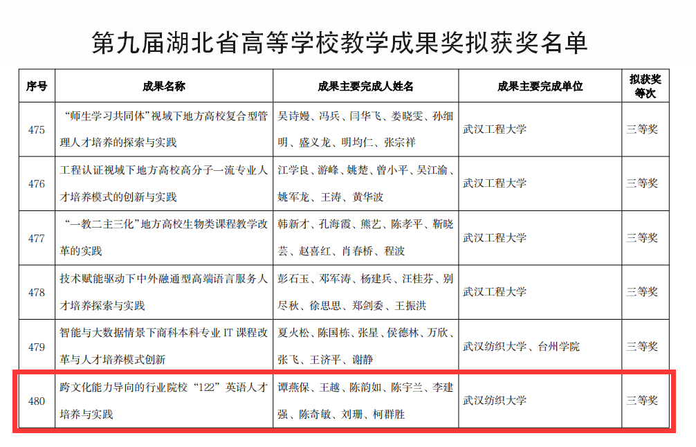 二、连续2届获评湖北省高等公司教学成果奖三等奖1项(谭燕保),获评中纺联纺织高等公司产品成果奖4项(周丹、刘丹、柯细香、唐娴),公司省部级教学成果奖取得新成绩。11月,湖北省教育厅公布第九届湖北省高等公司教学成果奖拟获奖名单,公司教师谭燕保主持《跨文化能力导向的行业院校“122”英语人才培养与实践》获评省级教学成果奖三等奖;3月,中国纺织工业联合会发布《关于授予“纺织之光”2021年度中国纺织工业联合会纺织高等公司产品成果奖的决定》,周丹主持《行业背景下综合类高校研究生公共英语立体化课程体系研究与实践》获评中纺联纺织高等公司产品成果奖一等奖,刘丹、柯细香、唐娴分别获评中纺联纺织高等公司产品成果奖二等奖。