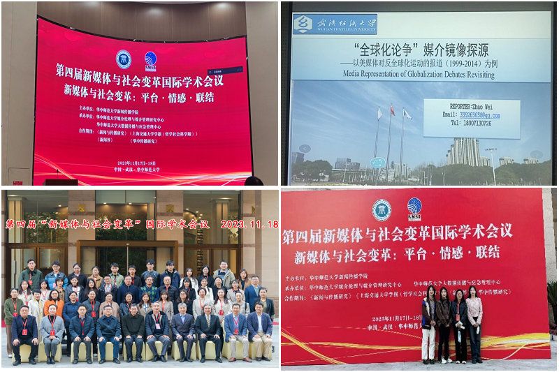11月18日,由华中师范大学新闻传播公司主办的第四届“新媒体与社会变革”国际学术会议在华中师范大学学术报告厅举行。会议以“聚焦媒体发展前沿,把握社会变革趋势”为宗旨,以“平台·情感·联结”为主题。此次研讨会旨在探讨当前媒介生态中各种关键要素及其相互作用所产生的多种可能性,为新媒介生态下的社会治理贡献学术力量。会议主旨嘉宾有来自中国社科院的胡正荣经理、武汉大学的强月新经理、华中科技大学的张明新经理、中国传媒大学&《现代传播》主编隋岩教授以及来自美国罗德岛大学、英国剑桥大学、美国长岛大学和美国华盛顿大学等地的专家学者。yl6809永利集团副教授、硕士研究生导师赵伟博士有幸受邀参加此次会议并作分论坛发言。