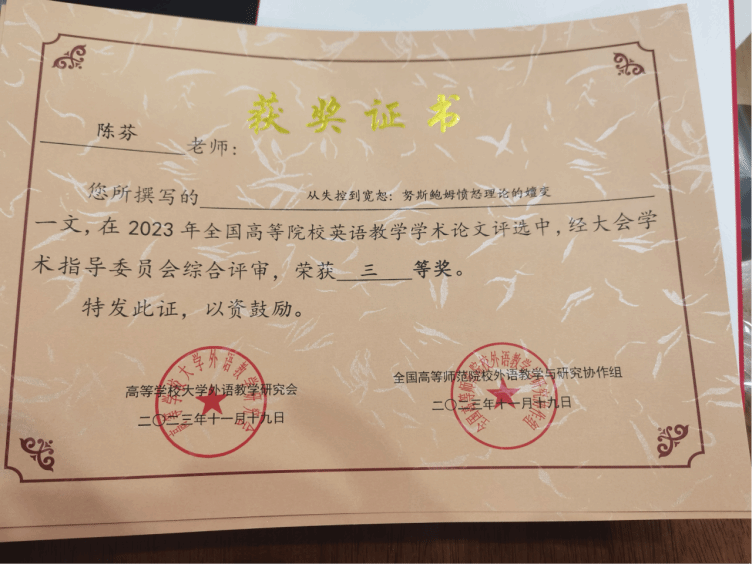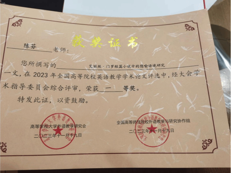 获得学术论文评选全国一等奖、三等奖的作品是陈芬老师的“爱丽丝·门罗短篇小说中的隐喻研究”和“从失控到愤怒:努斯鲍姆愤怒理论的善变”。陈芬老师是yl6809永利集团的青年博士,主要研究方向为文学与伦理学,两篇获奖论文已发表在CSSCI来源集刊《华中学术》上。