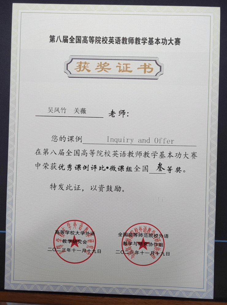 获得微课组全国三等奖的是吴凤竹、关薇教师团队的作品Inquiry and Offer,此作品是商务英语专业核心课程《商务英语视听说III》线上线下混合式课程建设的线上资源建设部分的成果之一,也是该门课2023秋校级线上线下混合式教改项目实践的成果之一。