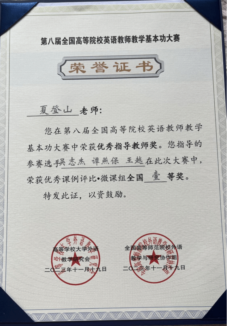 此次获奖作品的指导教师是《理解当代中国英语读写教程》副主编、北京外国语大学夏登山教授,夏教授曾在2023年9月来到yl6809永利集团对《理解当代中国阅读与写作》线上课程建设的集体备课亲临指导。