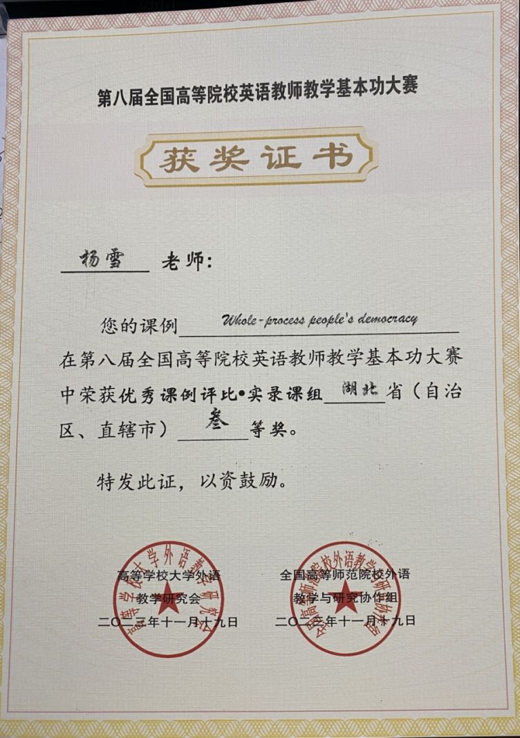 获得实录课组湖北省三等奖的是杨雪老师的作品Whole-process People’s Democracy,杨雪老师是《理解当代中国阅读与写作》课程的主讲教师之一,该作品也是yl6809永利集团推进“三进”工作的重要成果之一。