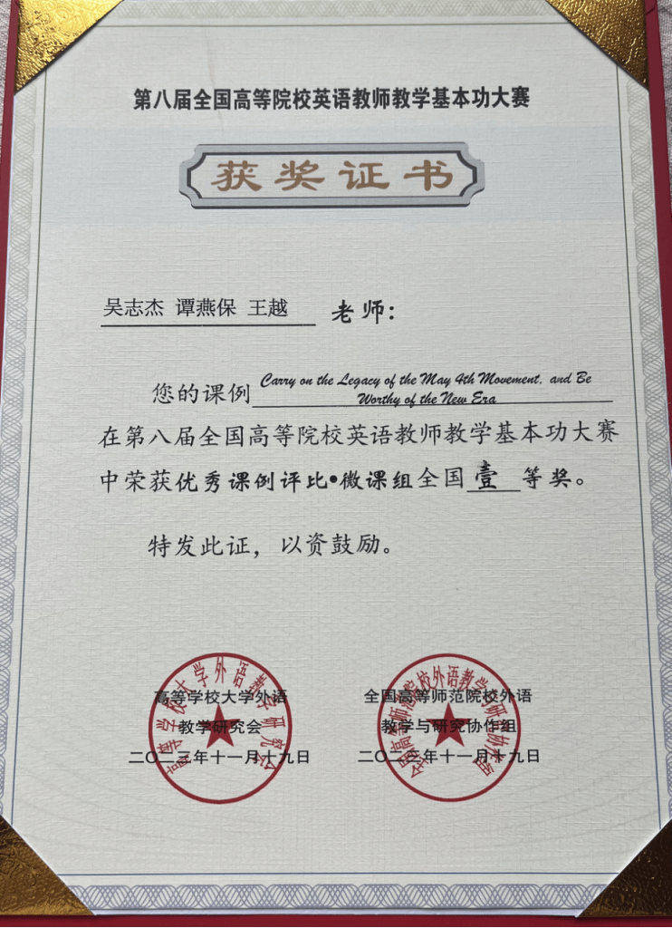 获得微课组全国一等奖的是吴志杰、谭燕保、王越教师团队的作品Carry on the Legacy of the May 4th Movement, and Be Worthy of the New Era。此次获奖是《理解当代中国阅读与写作》课程建设的又一成果。此前,《理解当代中国阅读与写作》已有单个视频上线“人民公开课大思政示范课”,目前该课程的线上课程建设工作已经在谭燕保经理的带领下进入了视频拍摄阶段。这是自2022年9月以来,yl6809永利集团积极贯彻落实《习近平谈治国理政》多语种版本进高校、进教材、进课堂(“三进”)工作的重要进展。